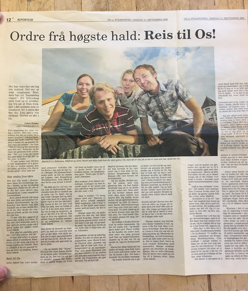 I 2008 flyttet en gjeng på fire personer til Os med en klar opplevelse av at Gud hadde kalt de til å flytte hit for å dele de gode nyhetene om Jesus Kristus og plante et nytt fellesskap. Det ble starten på Os-fellesskapet, som i dag har vokst til en gruppe på 40-50 mennesker i Os.